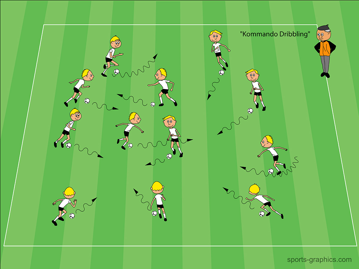 - Das erste Kommando heißt „Kommando Dribbling!“ und die Kinder dribbeln mit dem Ball durch das Feld. Auf „Kommando Stopp!“ halten die Kinder den Ball an und bleiben stehen. Ruft der Trainer nur „Stopp!“, dann dribbeln die Kinder weiter, weil das Wort „Kommando“ fehlte.