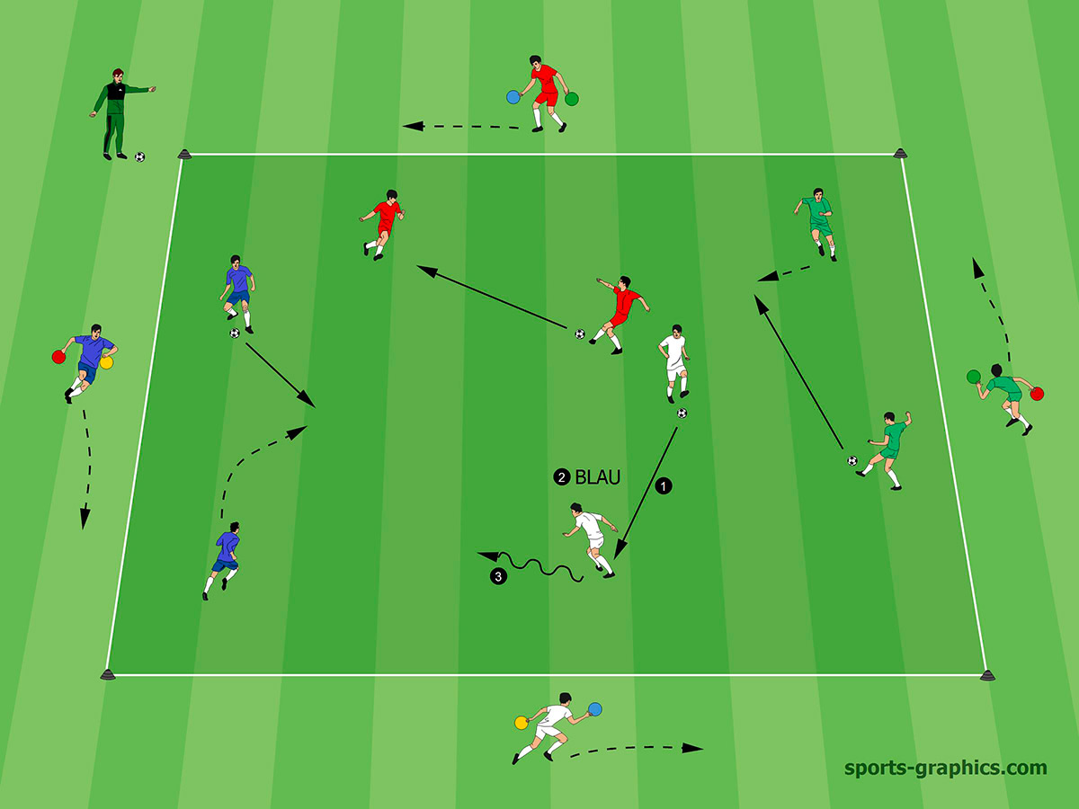 - Bei jedem erfolgreichen Pass durch ein Hütchentor, versucht der Passempfänger vor der Ballannahme (vgl. 4) die vom Trainer aktuell hochgehaltene Hütchenfarbe (hier Farbe BLAU) zu benennen (vgl. 3).