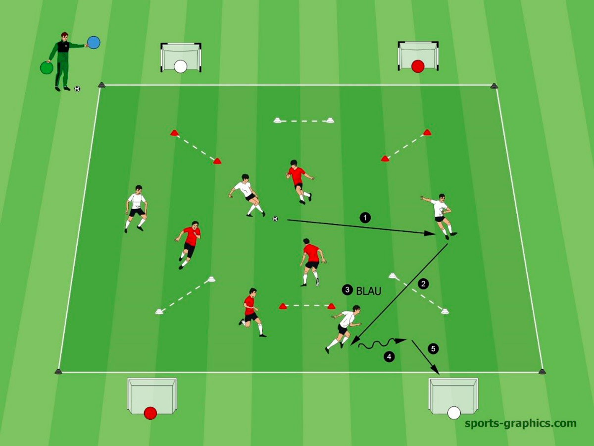 - Vorgabe im Spiel auf die Hütchentore (Wechsel im Bespielen der Hütchentore von ROT auf WEISS).
