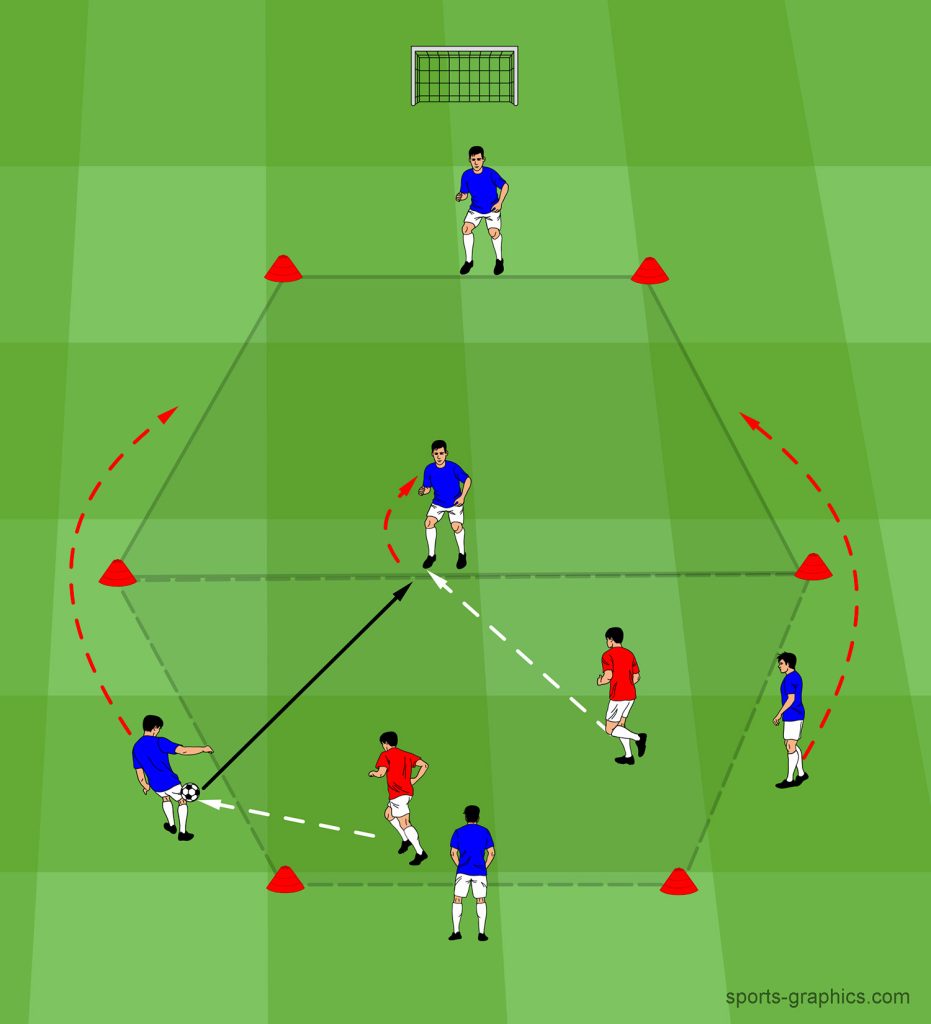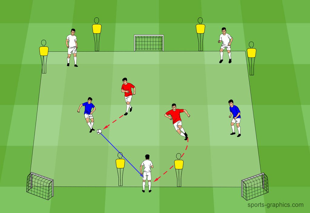 Bei dieser Übung liegt ein Schwerpunkt auf dem Spiel gegen den Ball und ein Schwerpunkt auf dem Zeitpunkt des Ballgewinns. Wichtig ist hierbei, eine einfache Lösung zu finden, um den Ball zu einem Mitspieler zu passen.