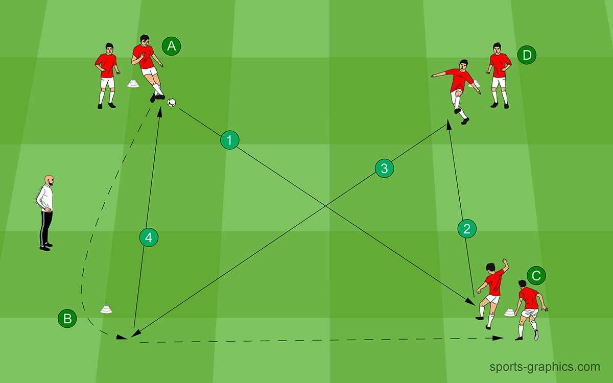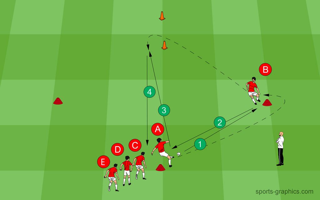 - Spieler A passt diagonal zu C und sprintet sofort außen um das Hütchen B.