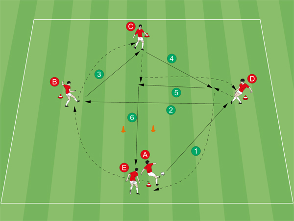 Organisation: Raute mit 5 – 6 Spielern, 1 Ball. 4 Hütchen außen und ein Passtor Ablauf: