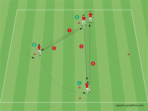 - B Sprintet im höchsten Tempo zur Position C, um den Pass von A zu erreichen und passt den Ball wieder direkt zurück zur Position A.