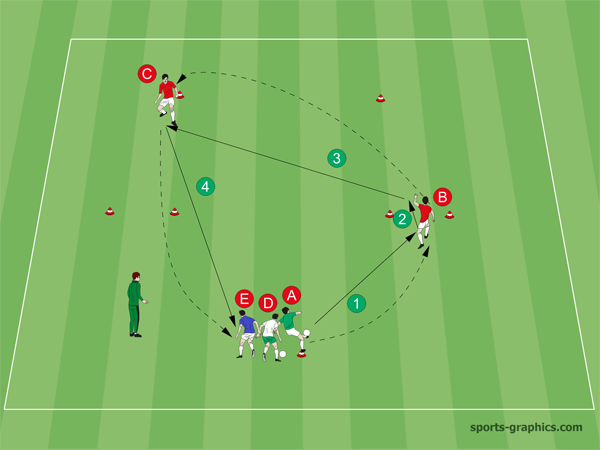 - D passt zu A, die den Ball in offener Stellung erwartet usw.