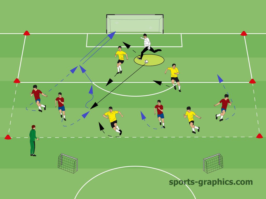 Die Ausgangsposition der einzelnen Spieler verändern. Der Trainer spielt den Ball ein.