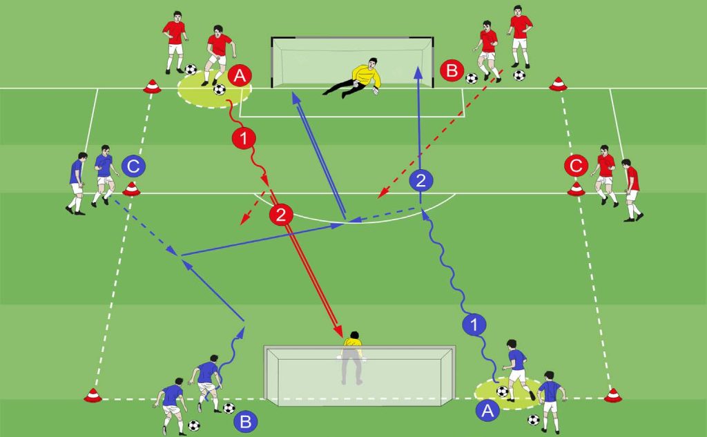 - Spieler A (rot) passt zu Spieler B (rot) und B legt zum Torschuss auf. Mit dem Torschuss dribbelt C (rot) Richtung Grundlinie und flankt zu B. B verwertet direkt (Kopf oder Fuß). Sofort gleicher Ablauf vom blauen Team.
