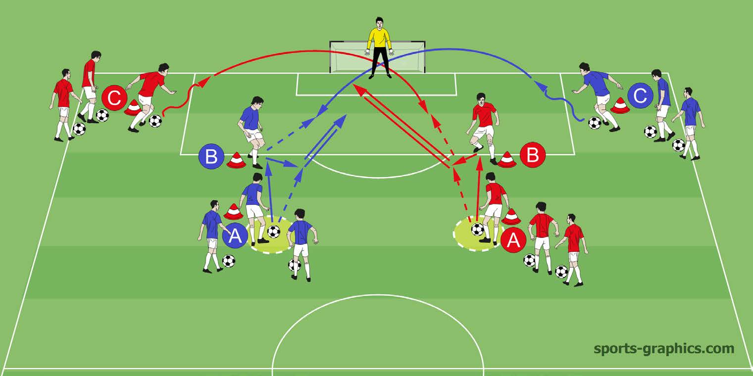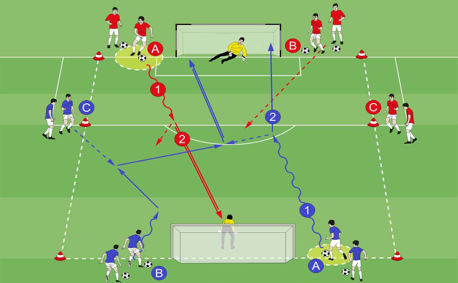 - Zwei Teams bilden und je einem Tor zuweisen. Je zwei Spieler zu den Positionen C. 2–5 Spieler zu den Positionen A / B mit Bällen.