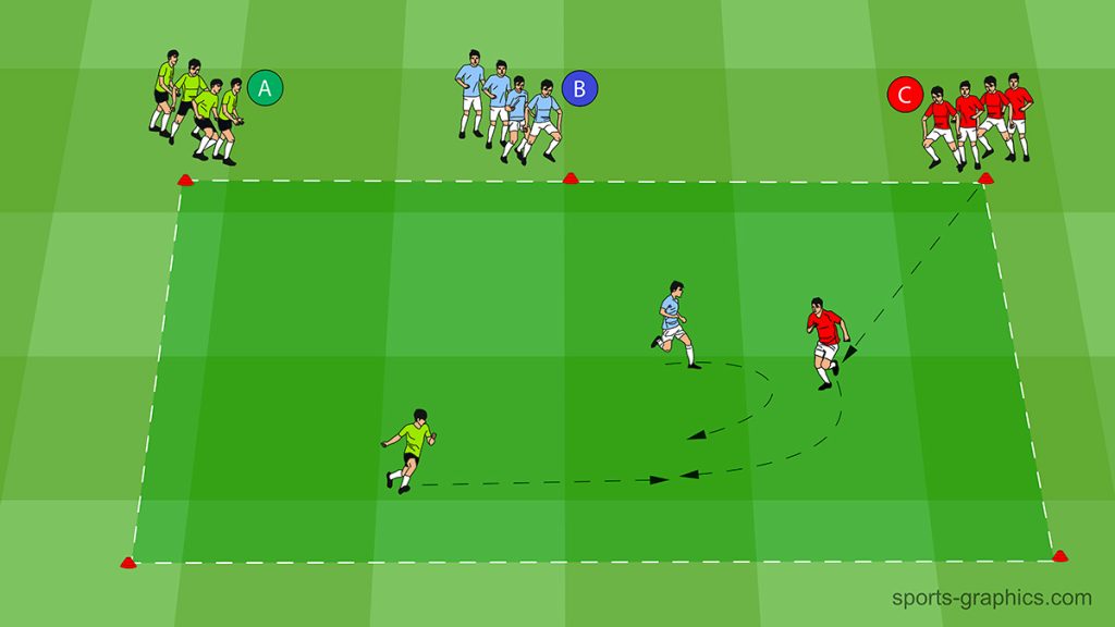 Feld 10m x 15m aufbauen (Größe hängt vom Alter und den Sprintfähigkeiten der Spieler ab), 3 Gruppen einteilen. Es ist ein Fangspiel mit einer vorgegebenen Zeit für jede Gruppe.