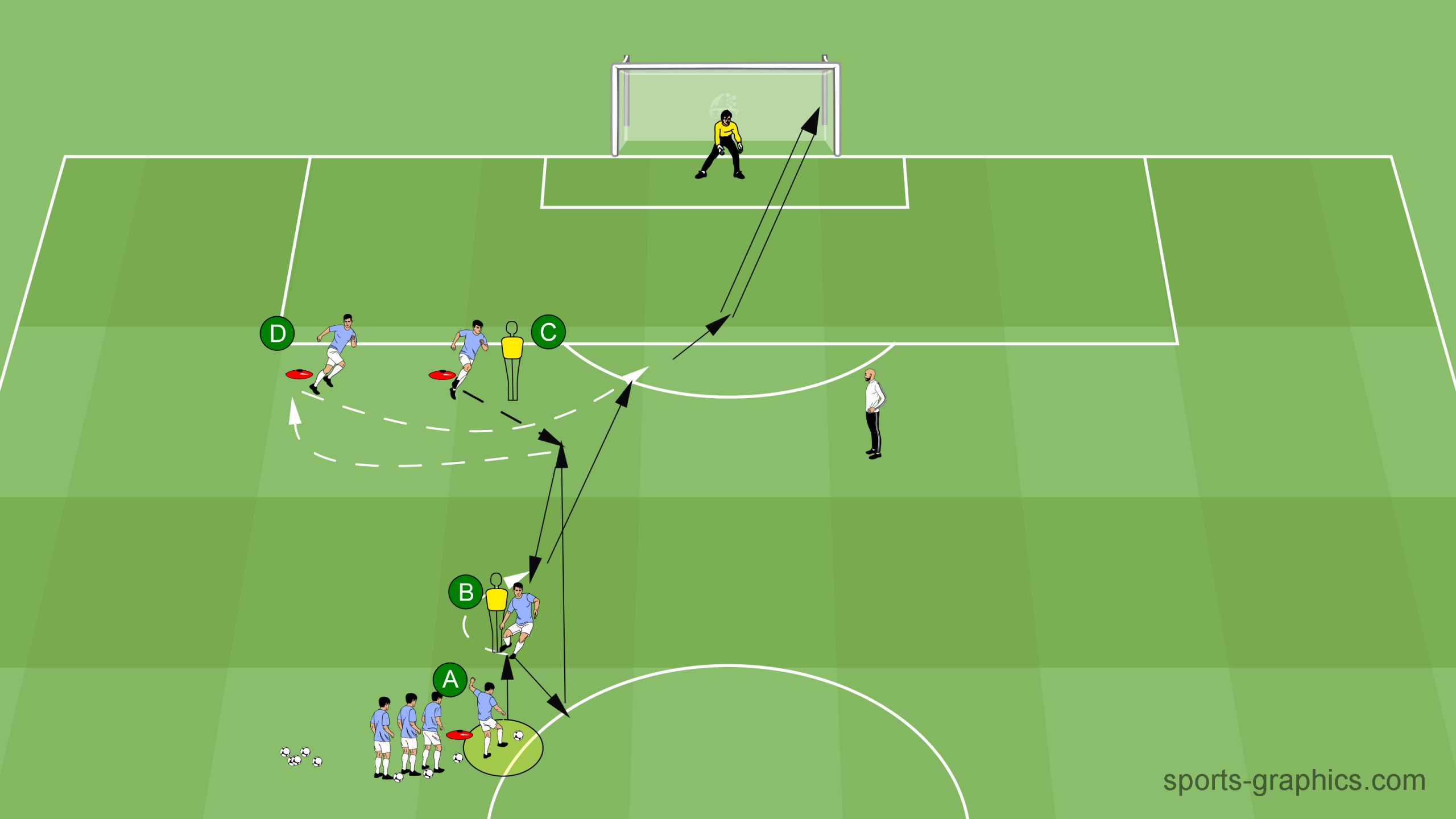 Zwei Dummies wie in der Zeichnung als „Gegenspieler“ aufbauen. An Position A – 8m vor dem ersten Dummy ist die Startposition mit 3-5 Spielern, am Dummy (B), am Dummy C und an Position D ist je ein Spieler, Im Großtor ist ein Torwart.