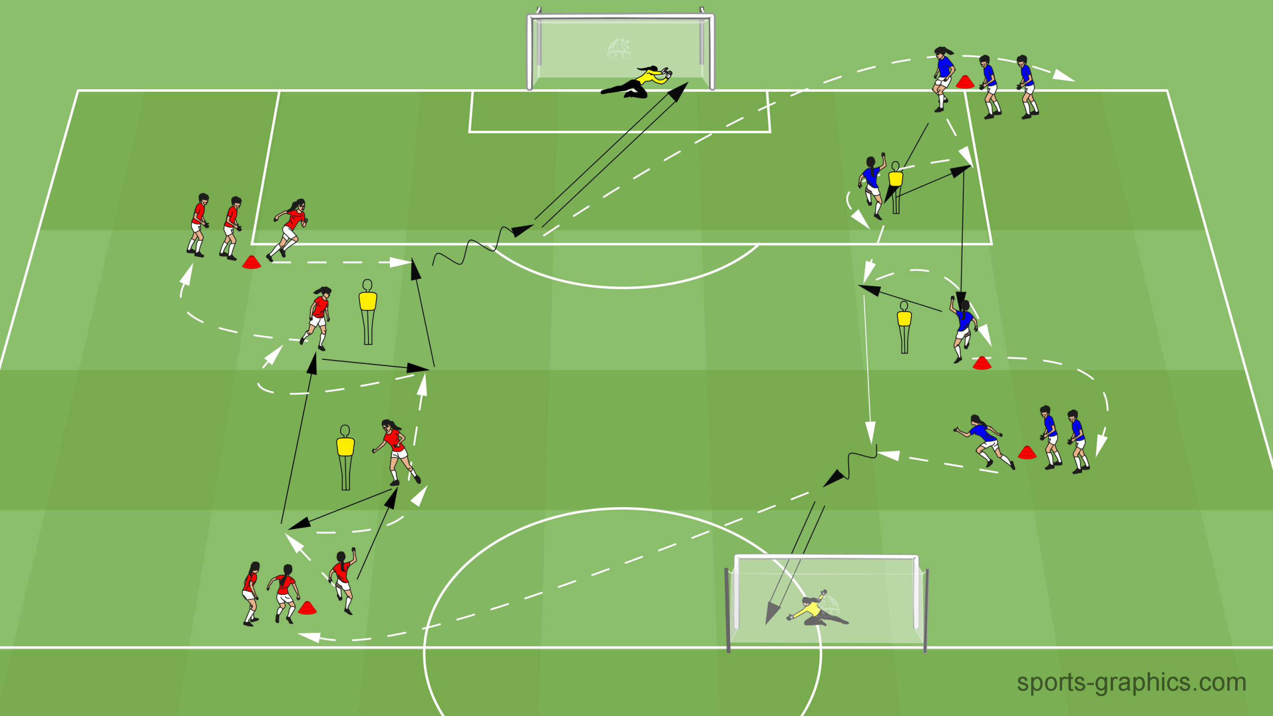 Derselbe Ablauf wie in der einseitigen Torschusskombination. Jetzt jedoch als Endlosform auf 2 Tore wie in der Zeichnung. Die Torschützen stellen sich hinter den Spielern auf der anderen Seite an.