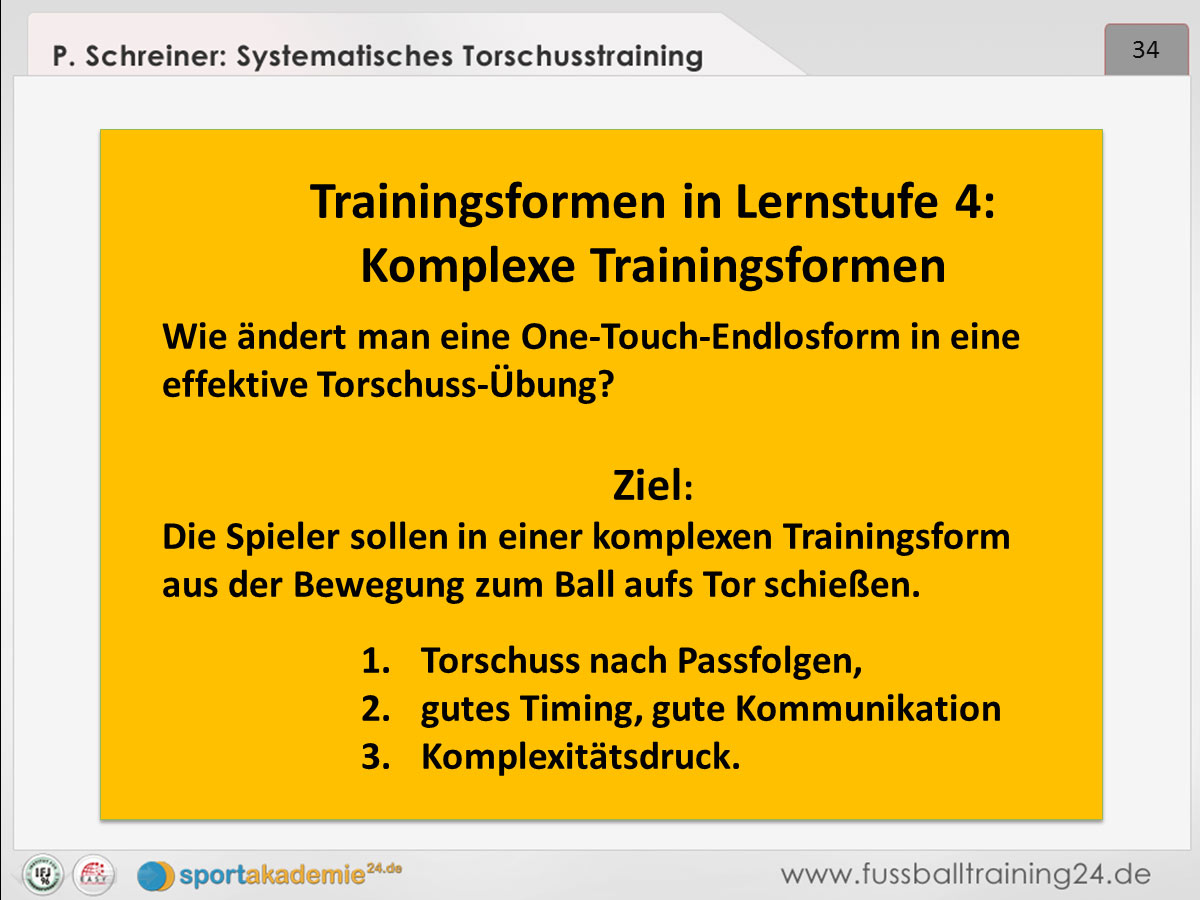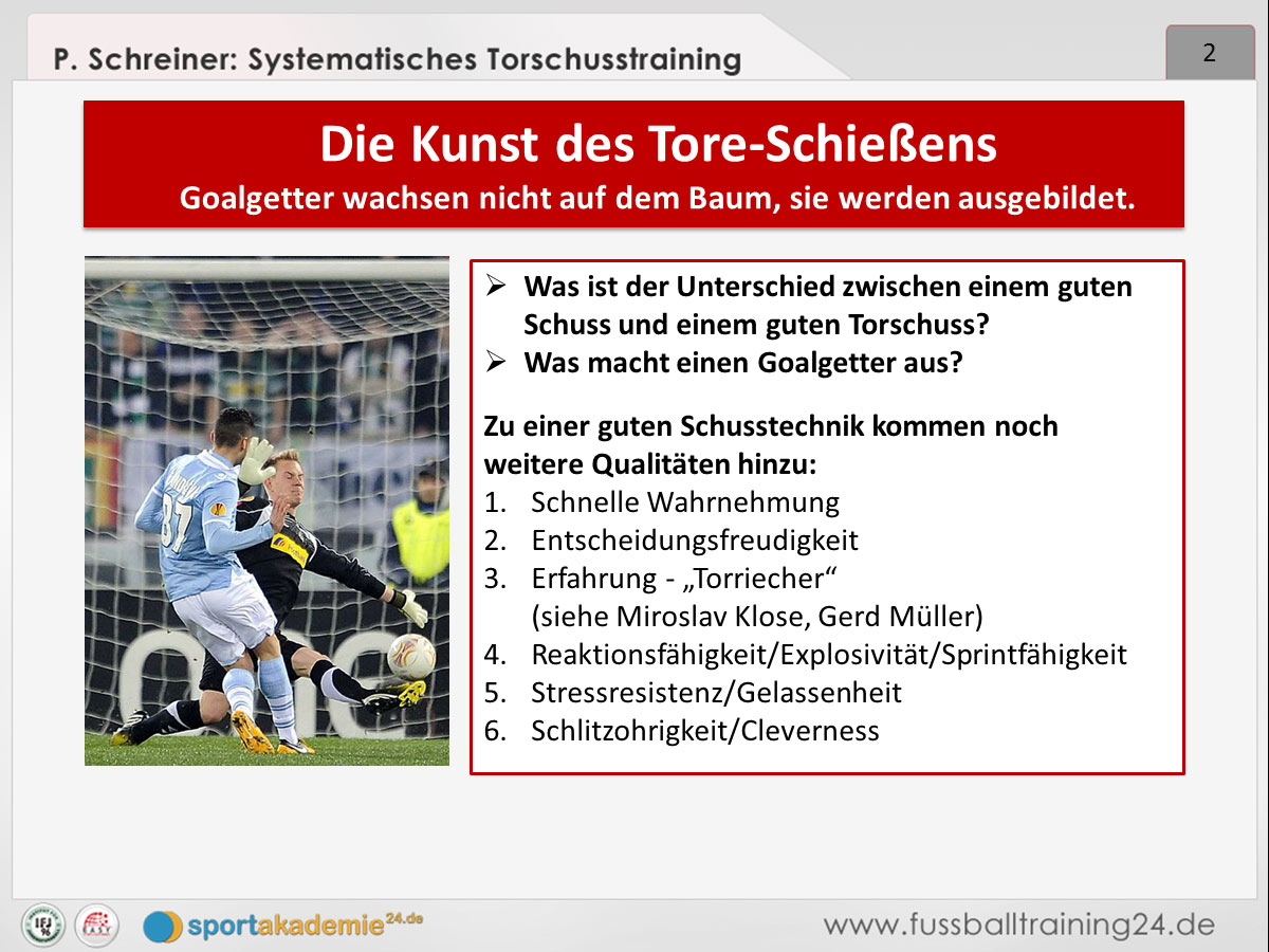 Peter Schreiner stellt sein Ausbildungssystem zum Thema “TORSCHUSS-TRAINING – In 8 Entwicklungsstufen vom Anfänger zum Torjäger” vor.