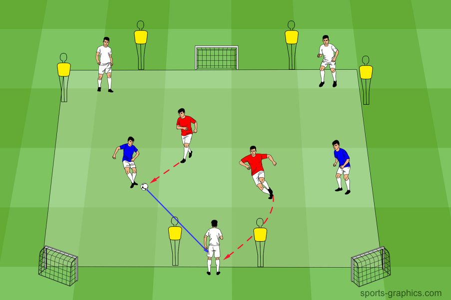 - Nach 5 erfolgreichen Pässen verlagern sie das Spiel über den vierten gelben Spieler im „steil-klatsch“ zur anderen Seite.